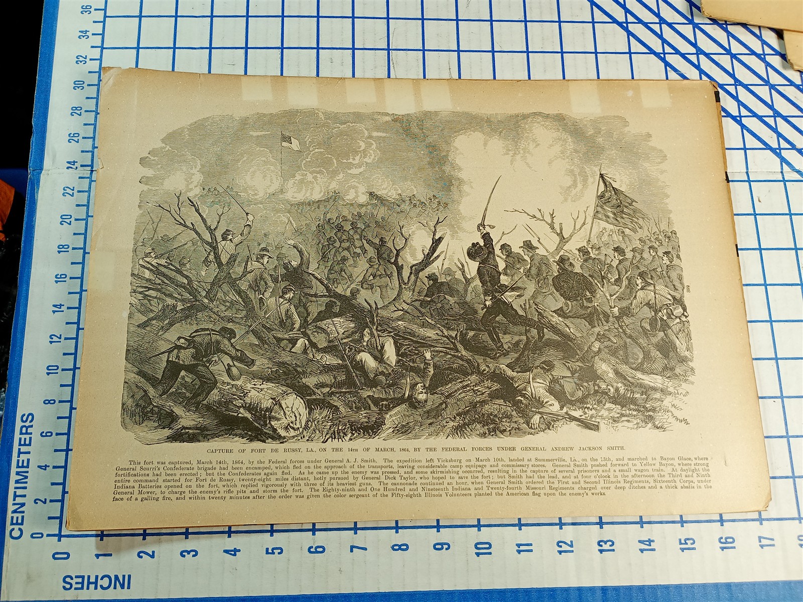 1800s Engraving 2 sided CIVIL WAR; FORT DE RUSSY, LA 1864 Andrew Jackson Smith