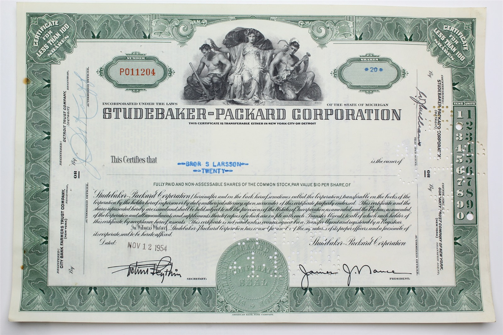 1954 Studebaker-Packard Corporation Stock Certificate - P011204 - 20 Shares