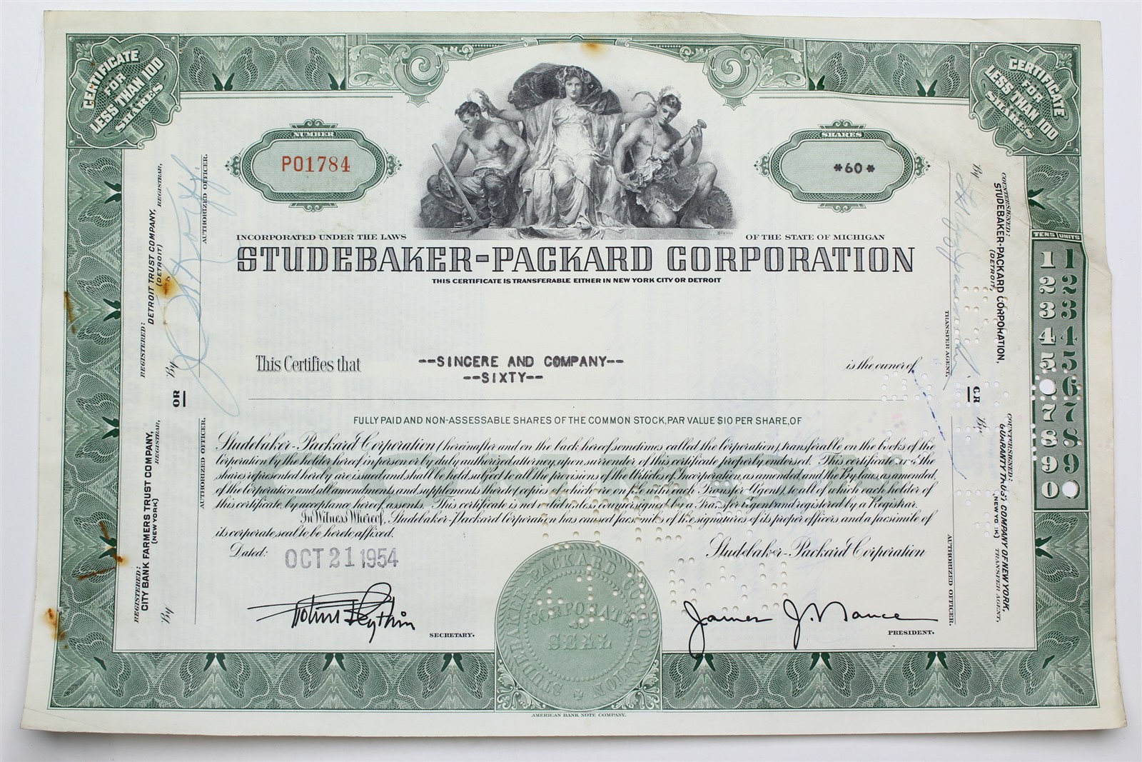 1954 Studebaker-Packard Corporation Stock Certificate - P01784 - 60 Shares