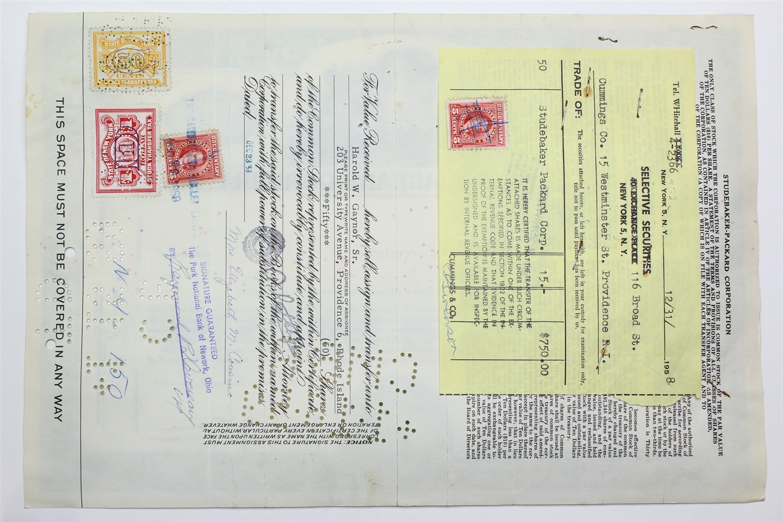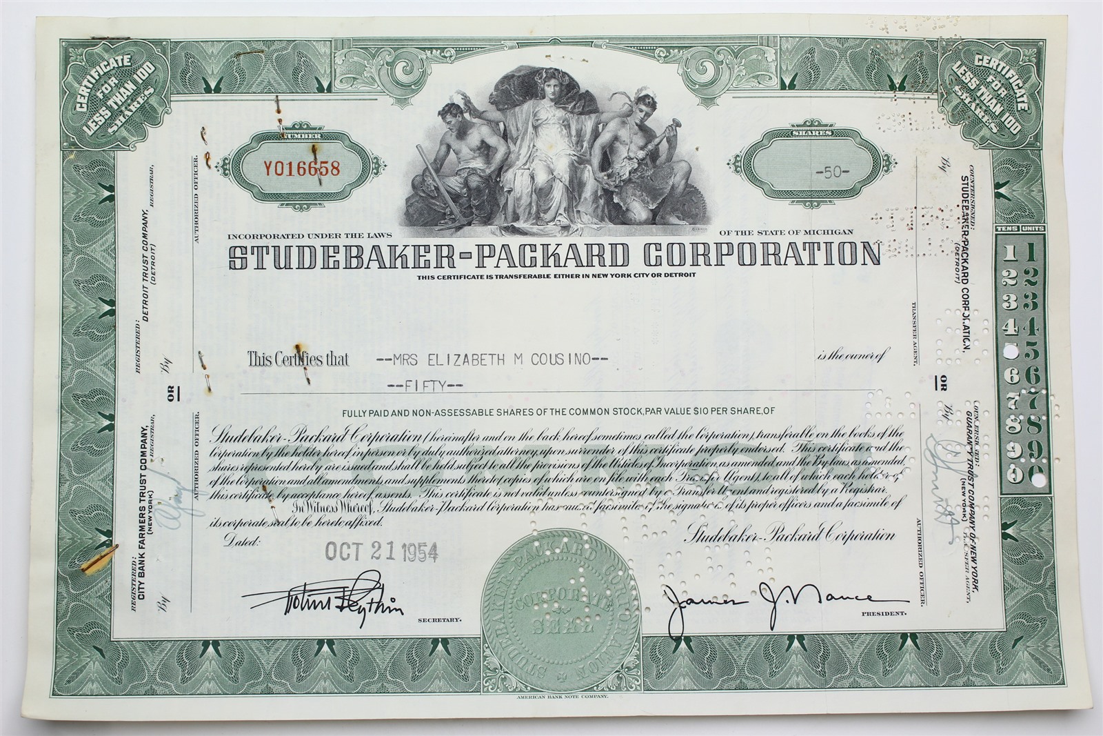 1954 Studebaker-Packard Corporation Stock Certificate - Y016658 - 50 Shares