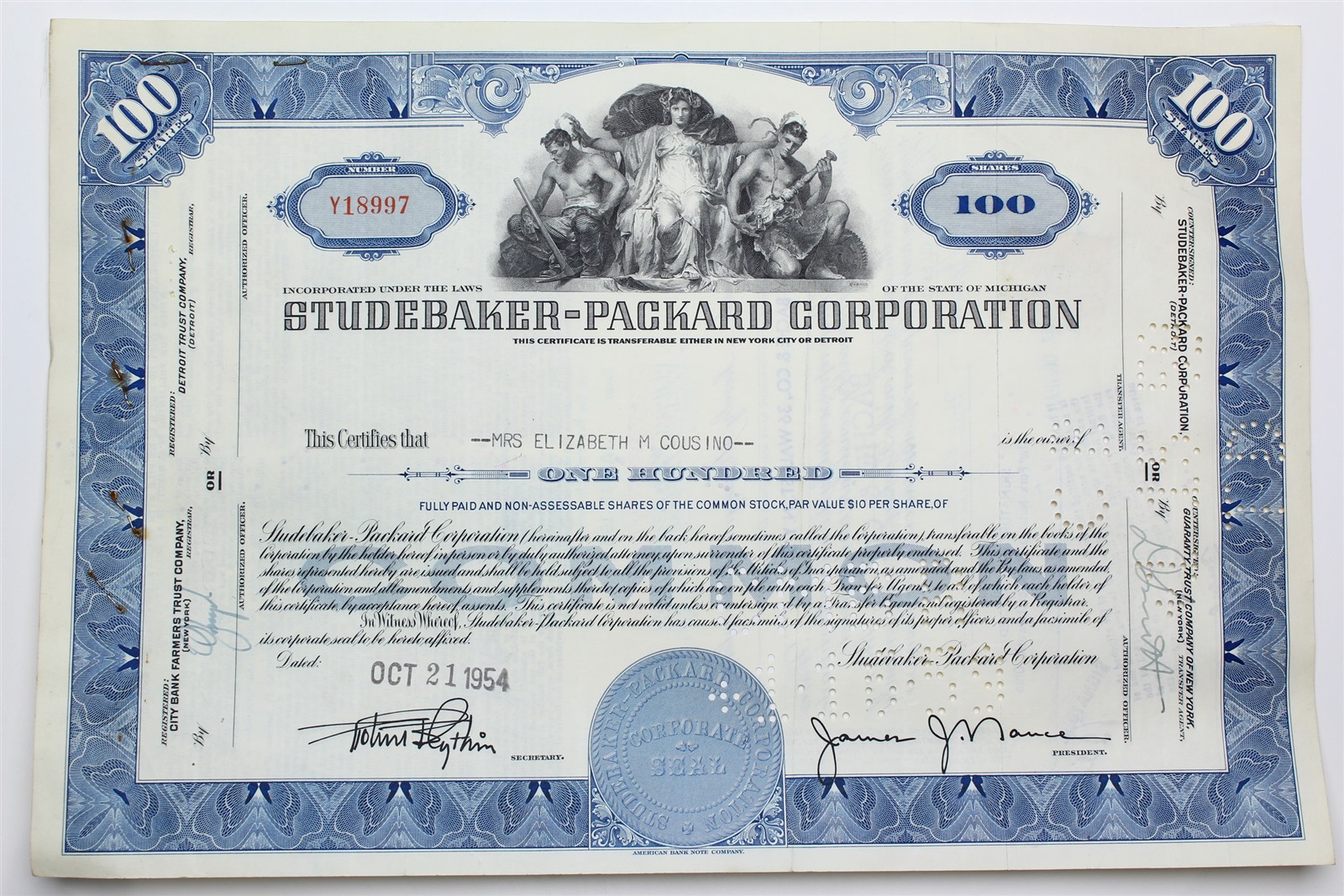 1954 Studebaker-Packard Corporation Stock Certificate - Y18997 - 100 Shares