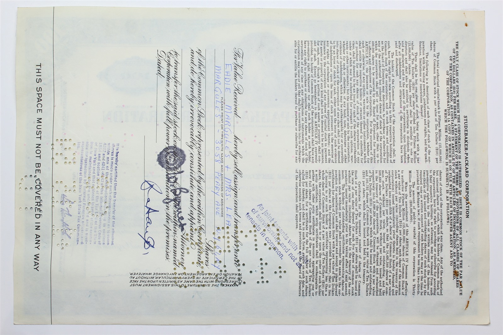 1954 Studebaker-Packard Corporation Stock Certificate - Y23255 - 100 Shares