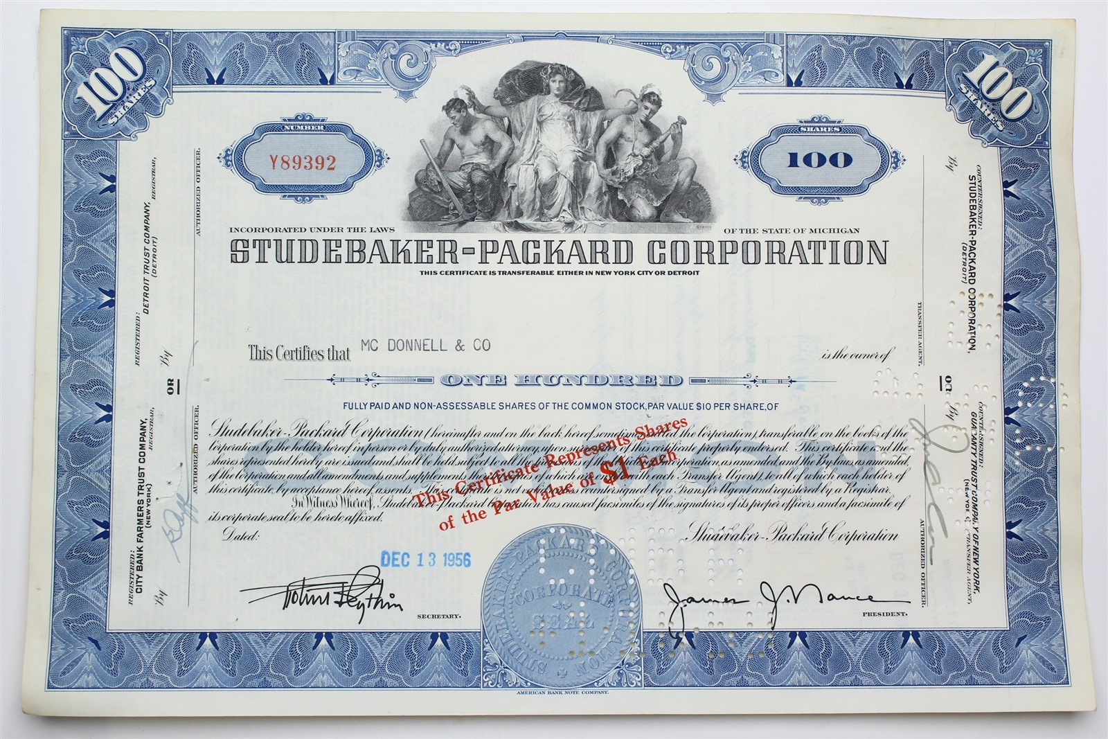 1956 Studebaker-Packard Corporation Stock Certificate - Y89392 - 100 Shares