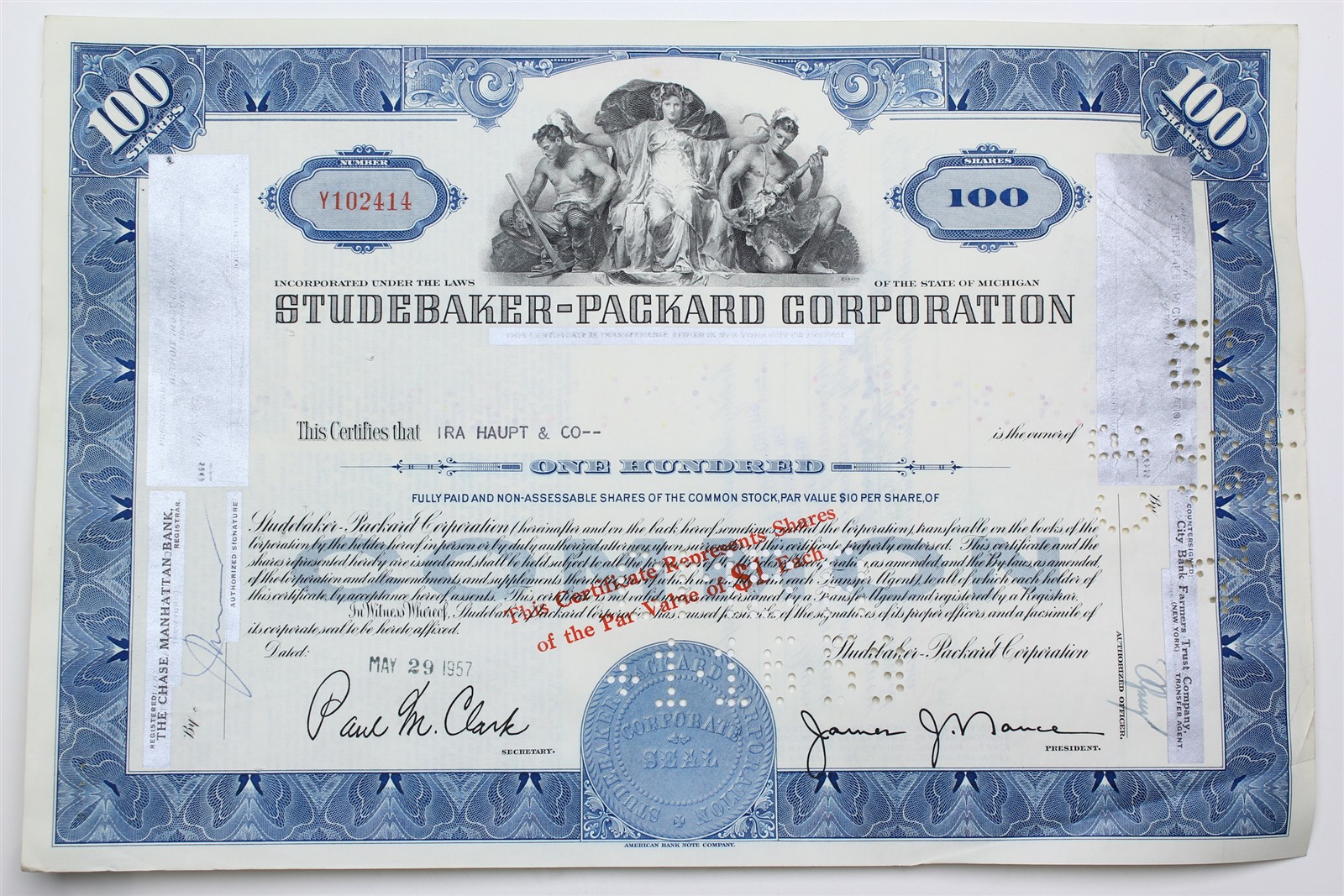 1957 Studebaker-Packard Corporation Stock Certificate - Y102414 - 100 Shares