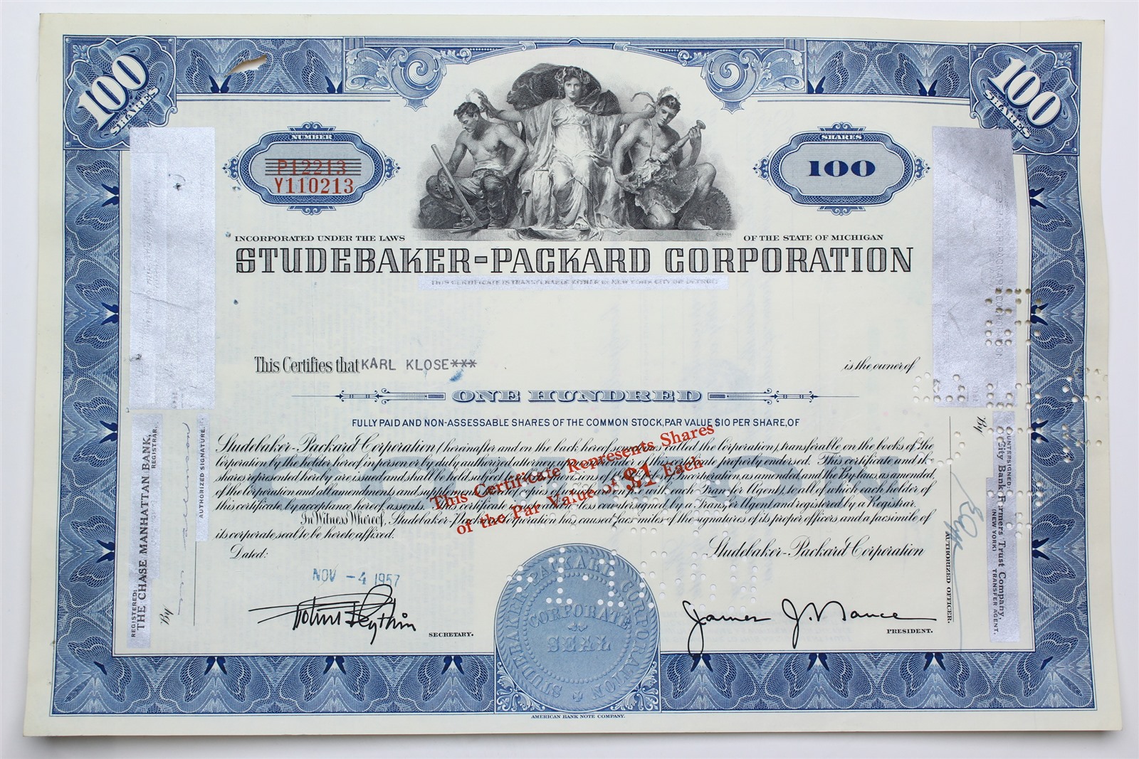 1957 Studebaker-Packard Corporation Stock Certificate - Y110213 - 100 Shares