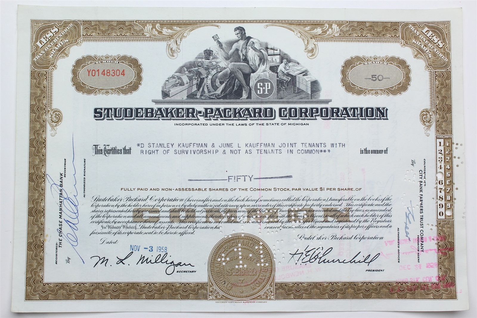 1958 Studebaker-Packard Corporation Stock Certificate - Y0148304 - 50 Shares