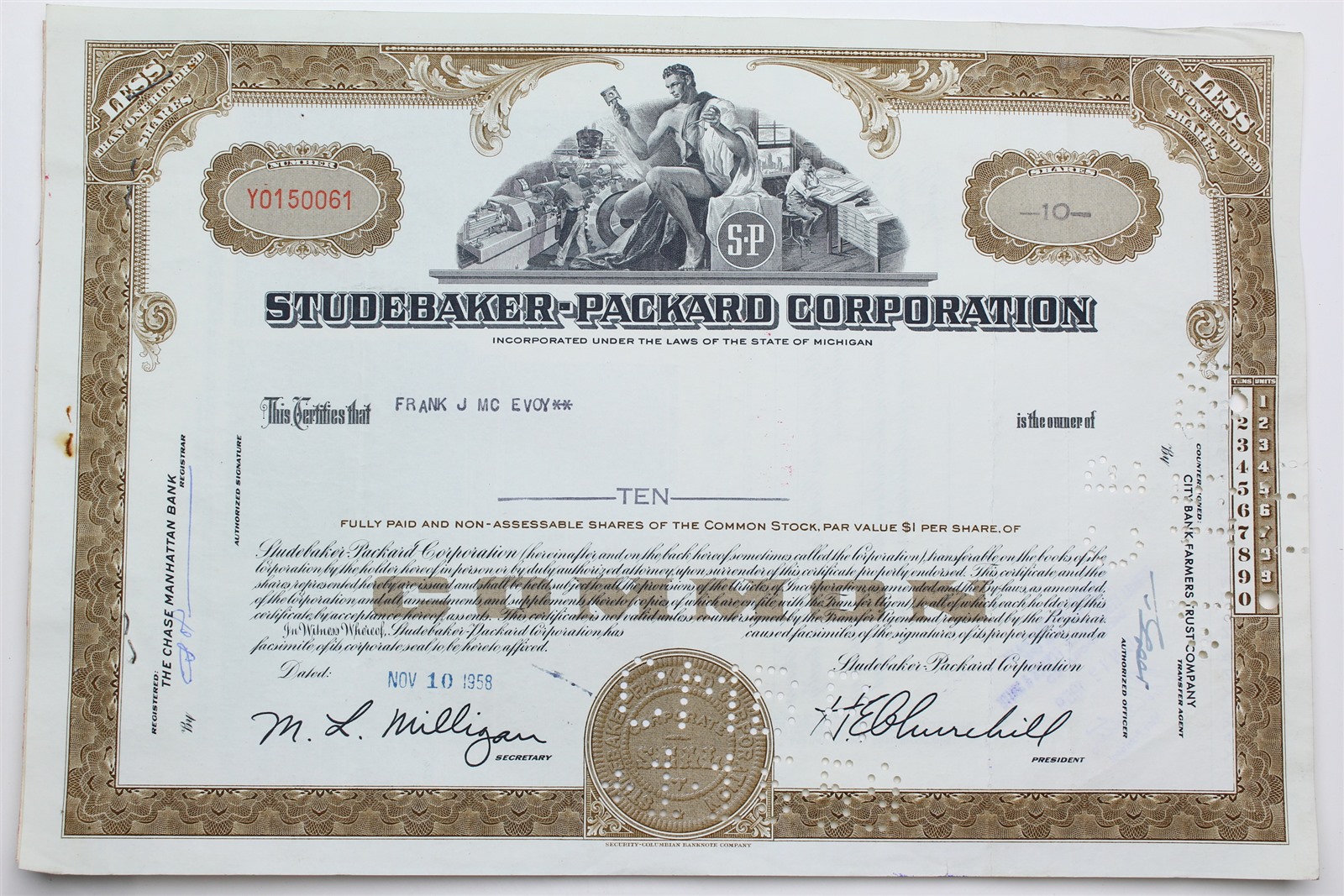 1958 Studebaker-Packard Corporation Stock Certificate - Y0150061 - 10 Shares