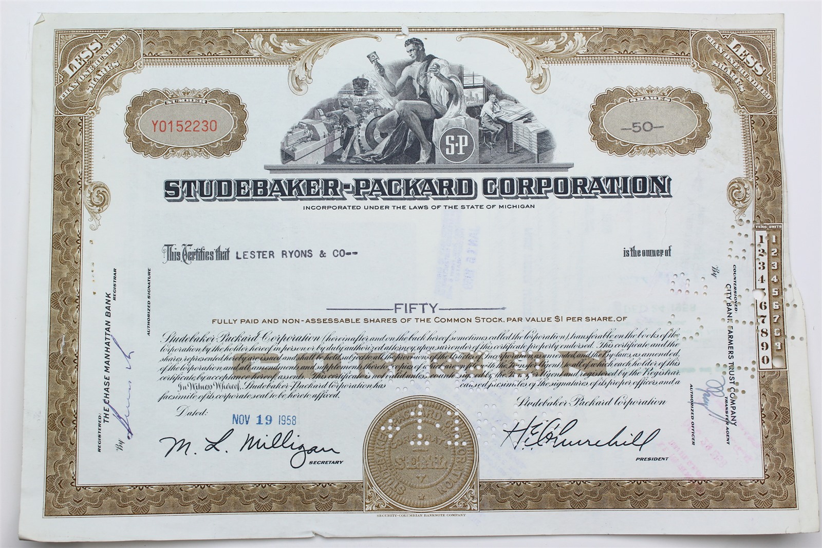 1958 Studebaker-Packard Corporation Stock Certificate - Y0152230 - 50 Shares