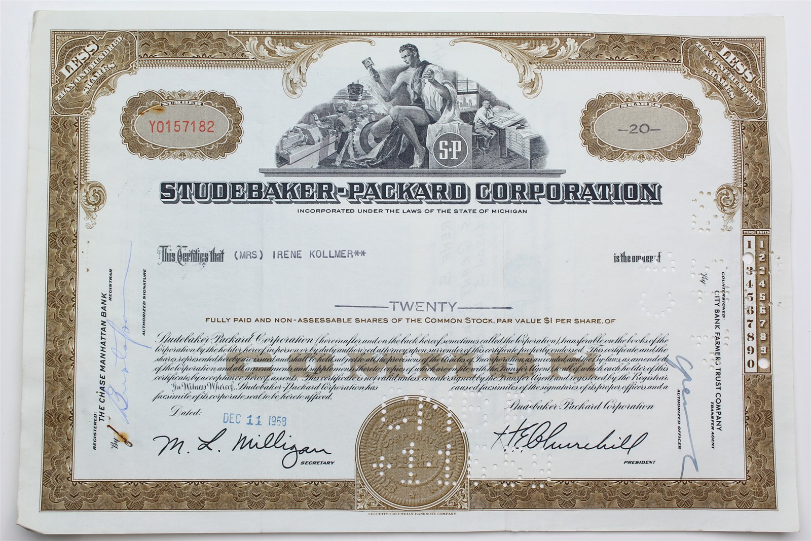 1958 Studebaker-Packard Corporation Stock Certificate - Y0157182 - 20 Shares