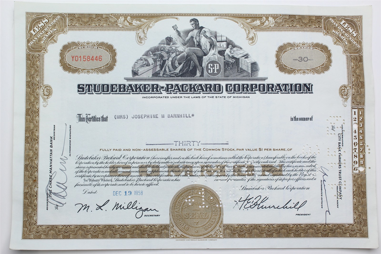 1958 Studebaker-Packard Corporation Stock Certificate - Y0158446 - 30 Shares