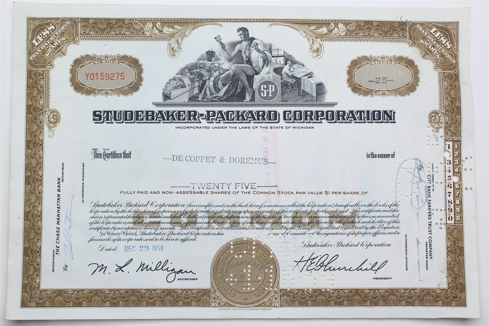 1958 Studebaker-Packard Corporation Stock Certificate - Y0159275 - 25 Shares