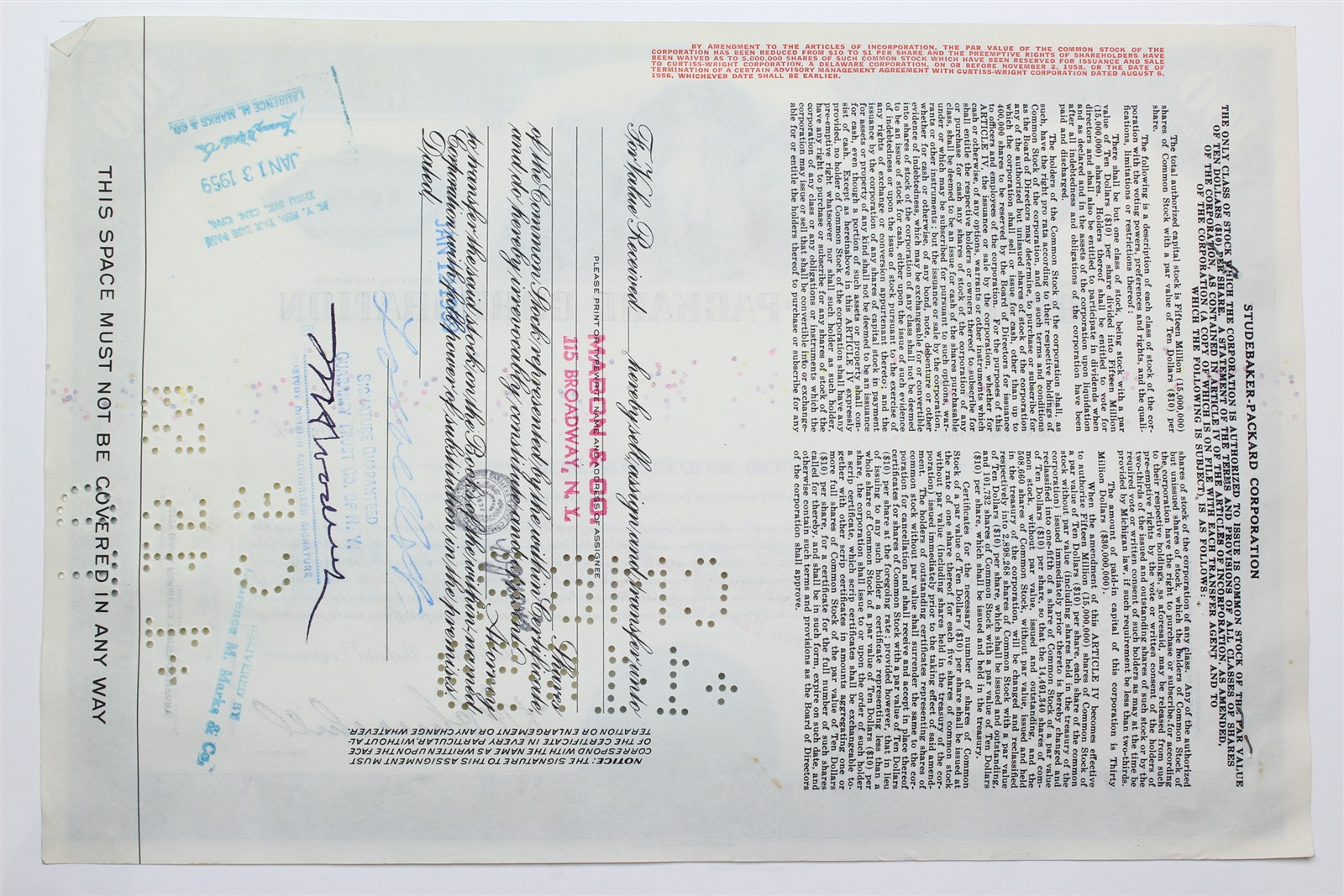 1958 Studebaker-Packard Corporation Stock Certificate - Y161851 - 100 Shares