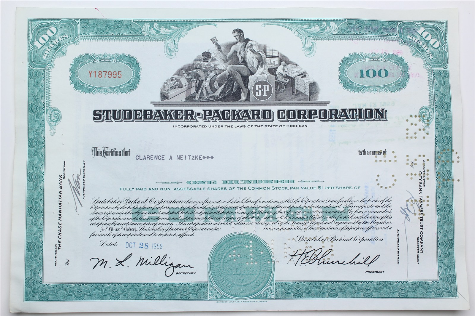 1958 Studebaker-Packard Corporation Stock Certificate - Y187995 - 100 Shares