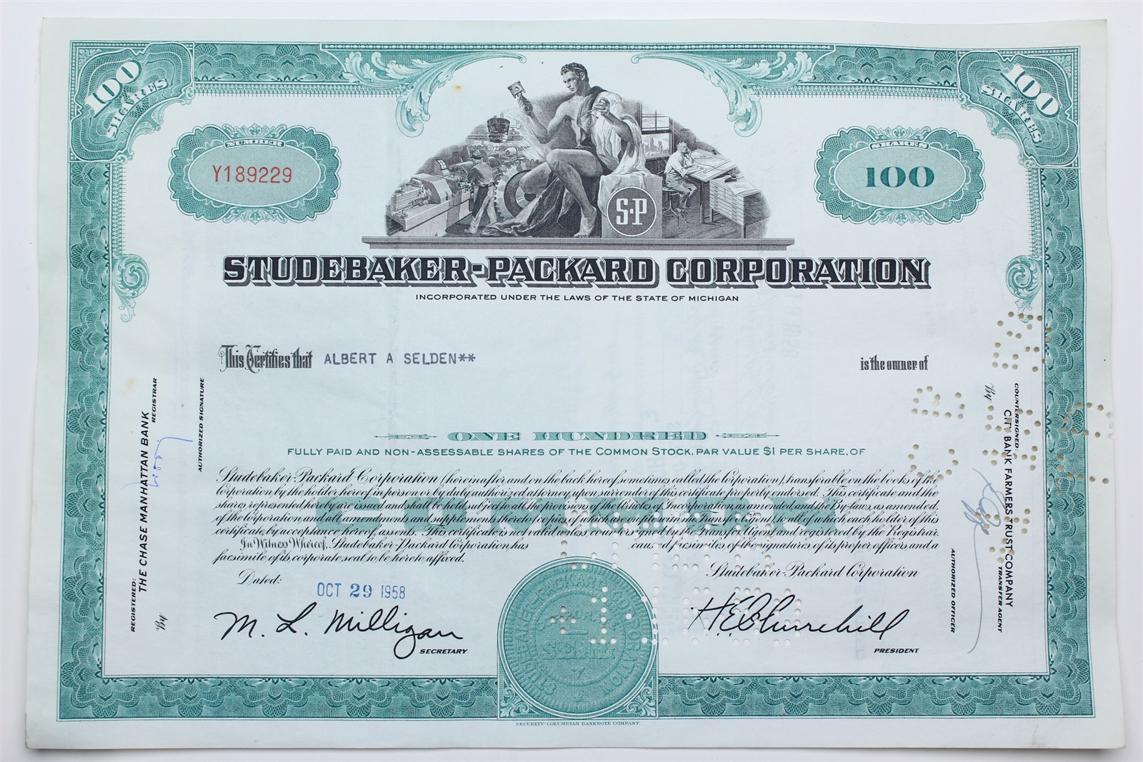1958 Studebaker-Packard Corporation Stock Certificate - Y189229 - 100 Shares