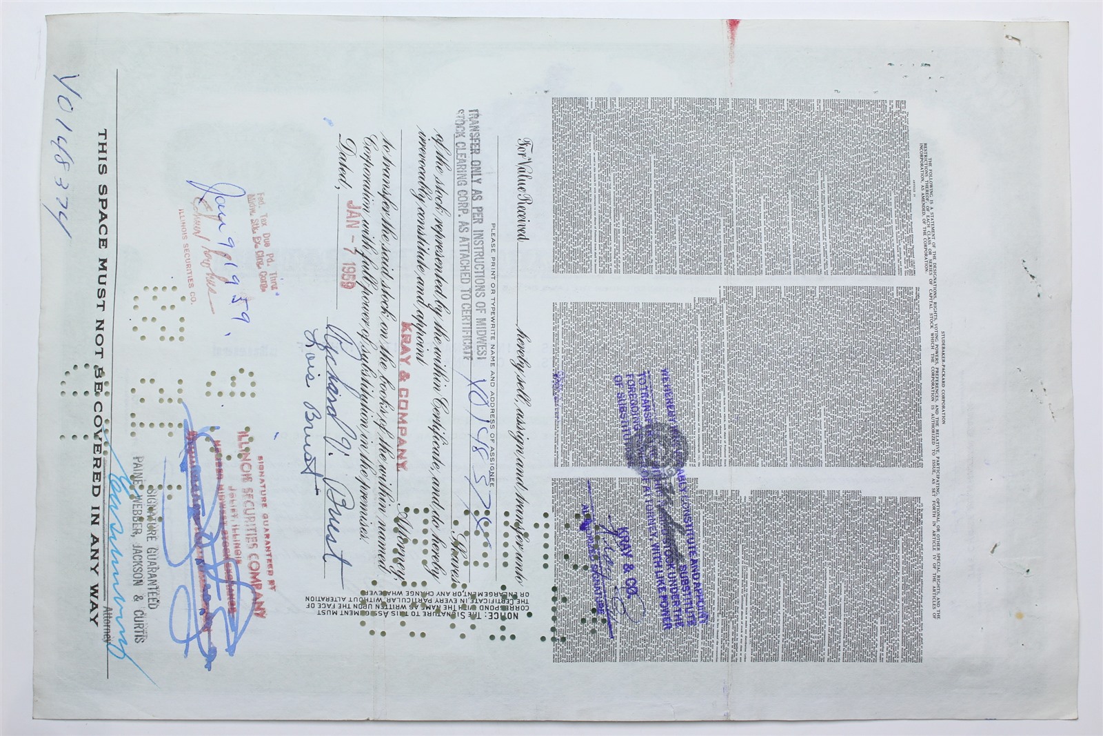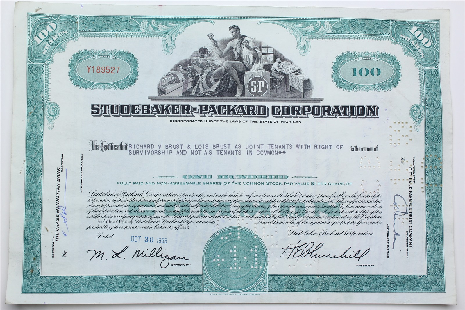 1958 Studebaker-Packard Corporation Stock Certificate - Y189527 - 100 Shares