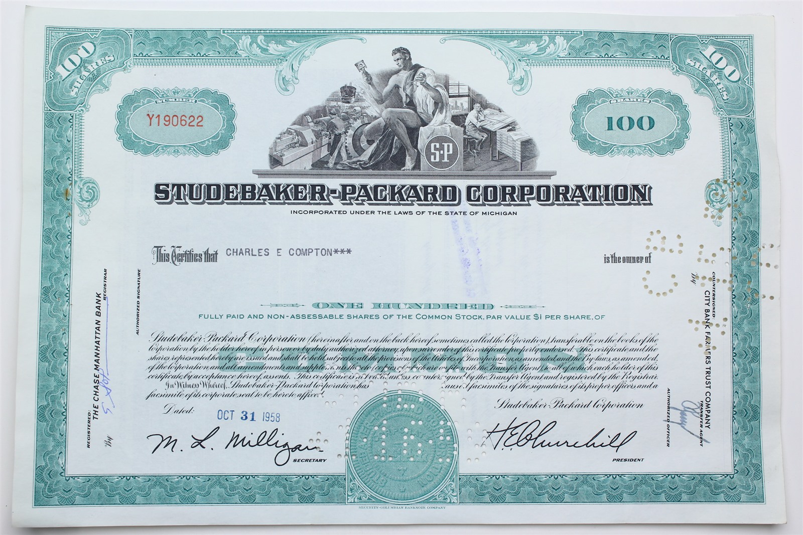 1958 Studebaker-Packard Corporation Stock Certificate - Y190622 - 100 Shares