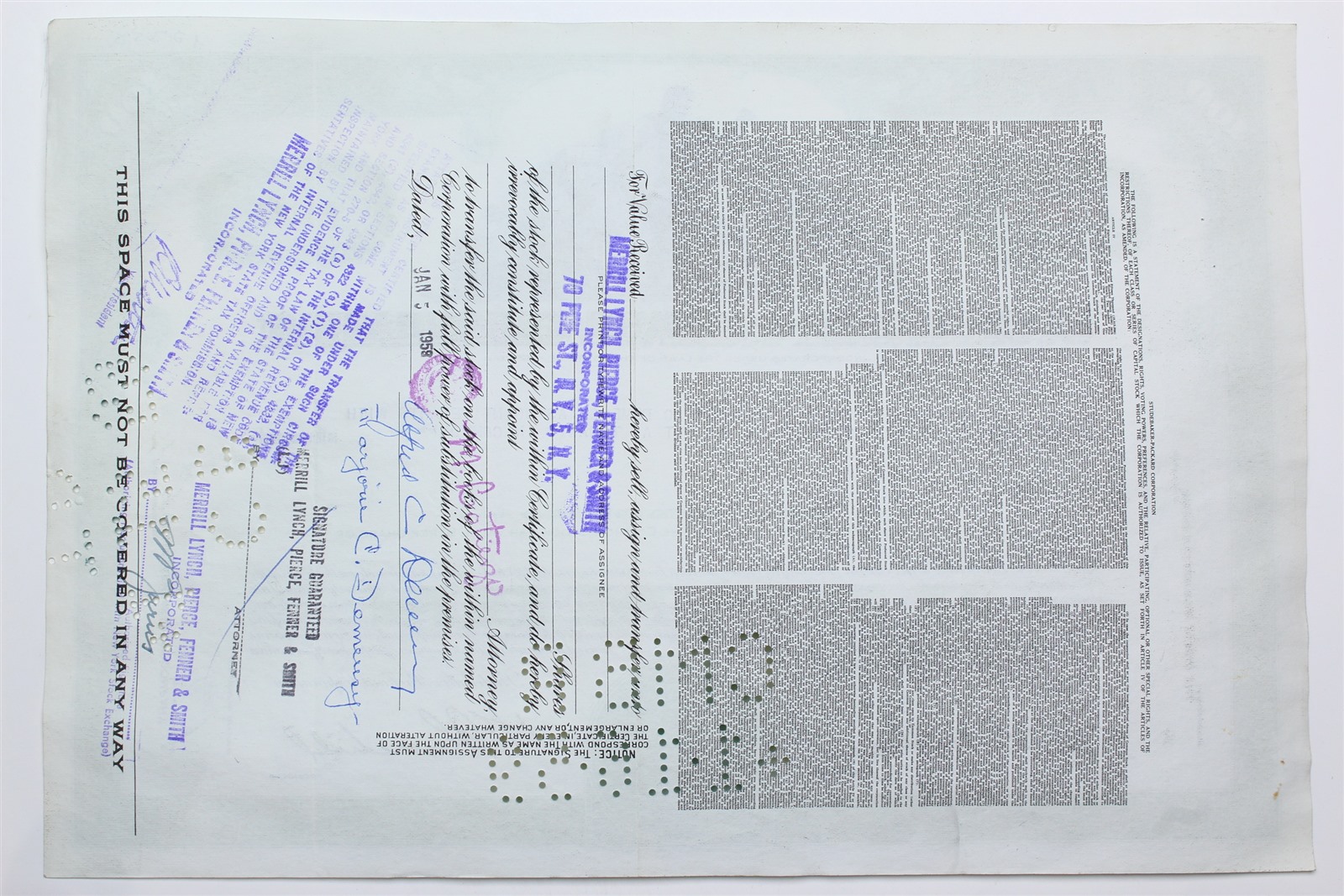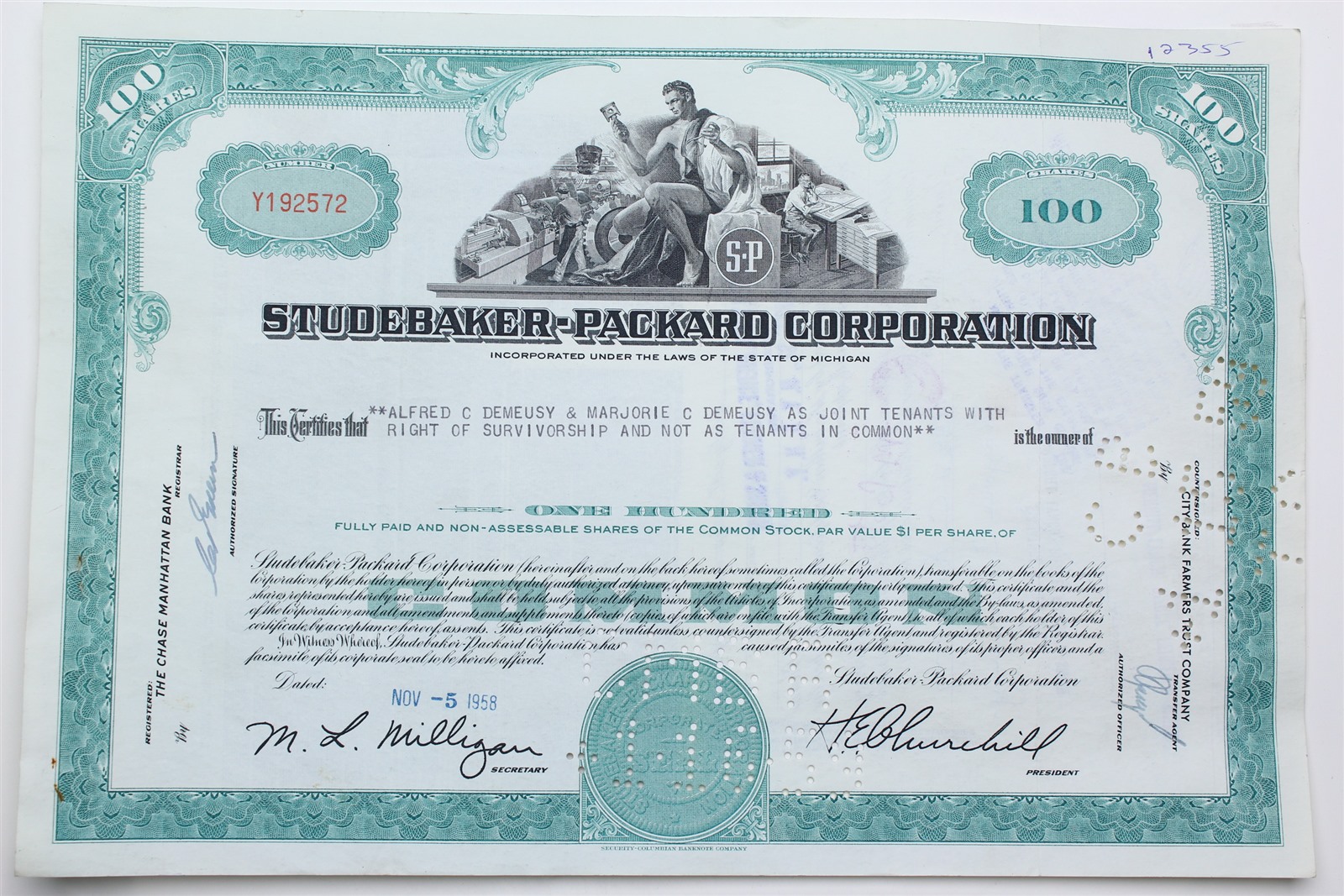 1958 Studebaker-Packard Corporation Stock Certificate - Y192572 - 100 Shares