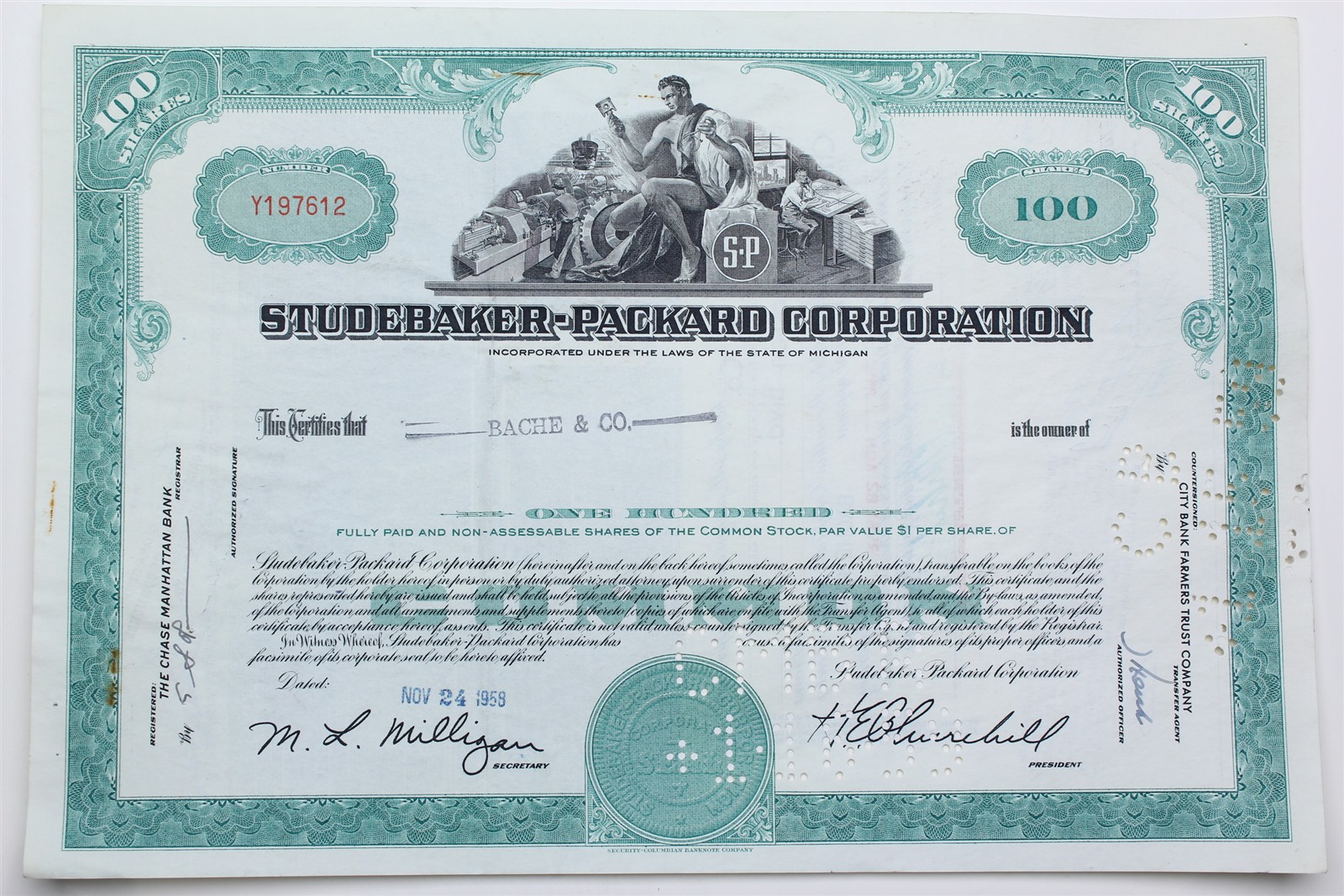 1958 Studebaker-Packard Corporation Stock Certificate - Y197612 - 100 Shares