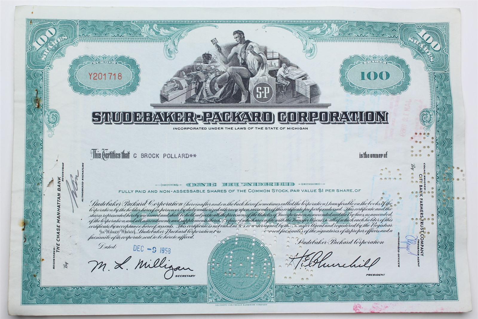 1958 Studebaker-Packard Corporation Stock Certificate - Y201718 - 100 Shares