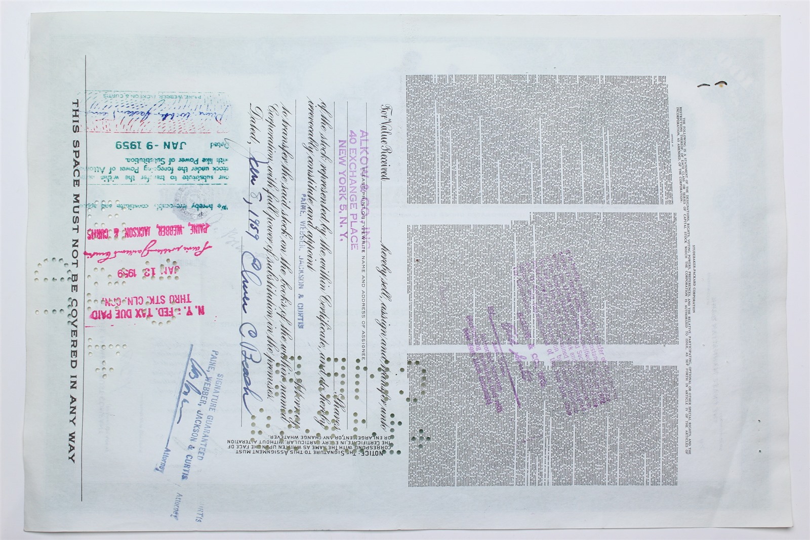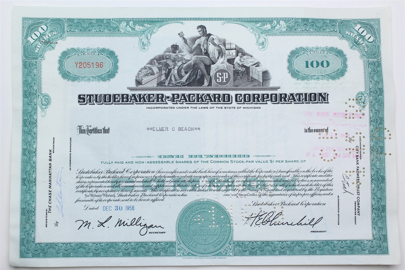 1958 Studebaker-Packard Corporation Stock Certificate - Y205196 - 100 Shares