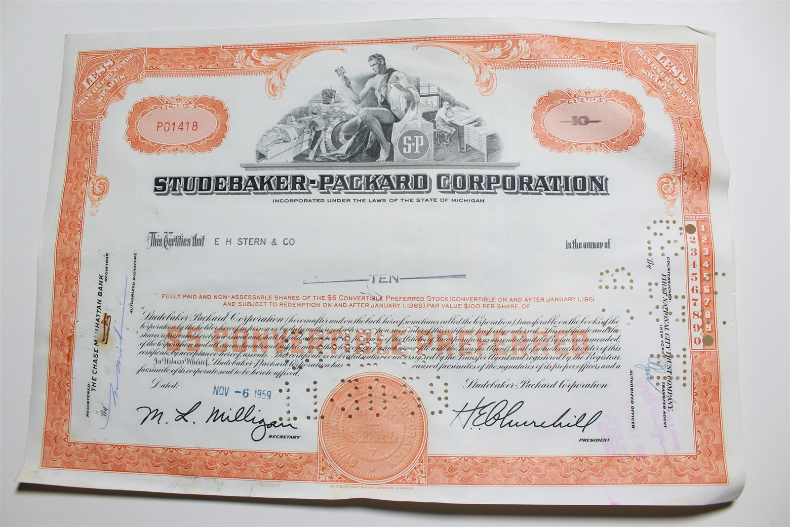1959 Studebaker-Packard Corporation Stock Certificate 10 Shares P01418