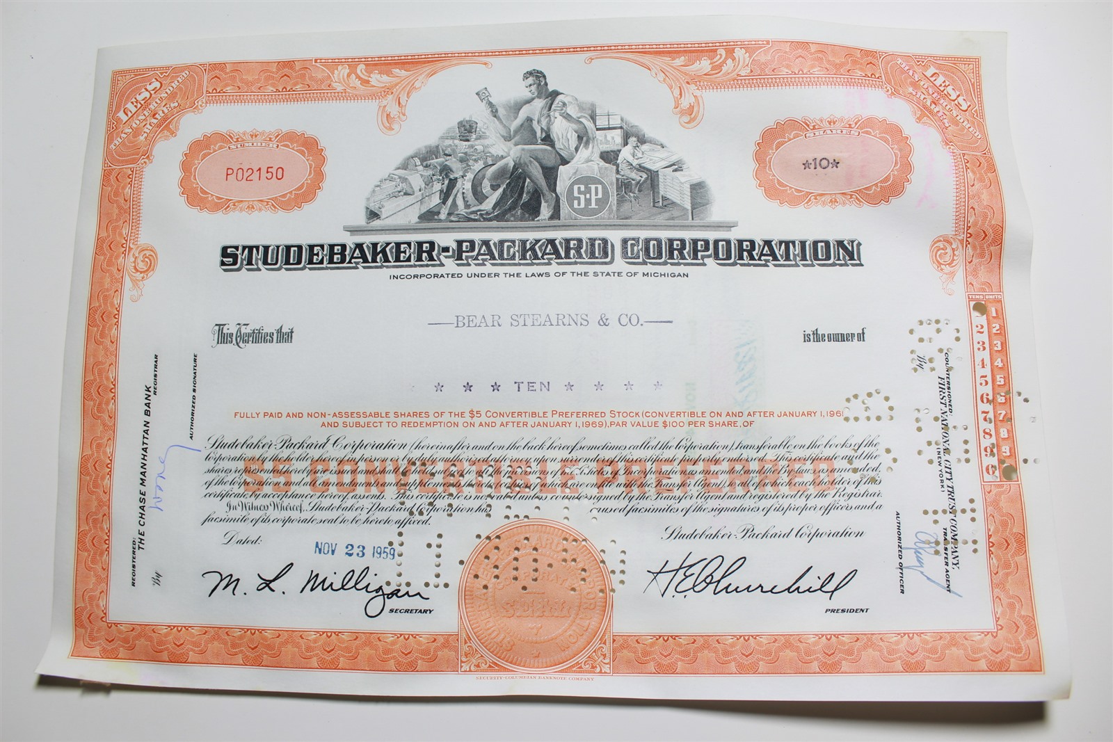 1959 Studebaker-Packard Corporation Stock Certificate 10 Shares P02150