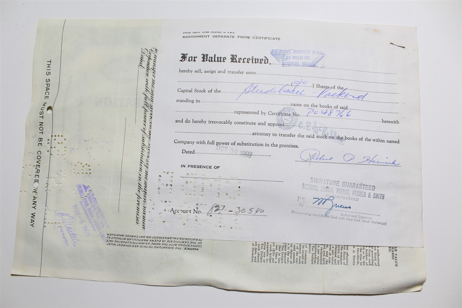 1959 Studebaker-Packard Corporation Stock Certificate 20 Shares P048766