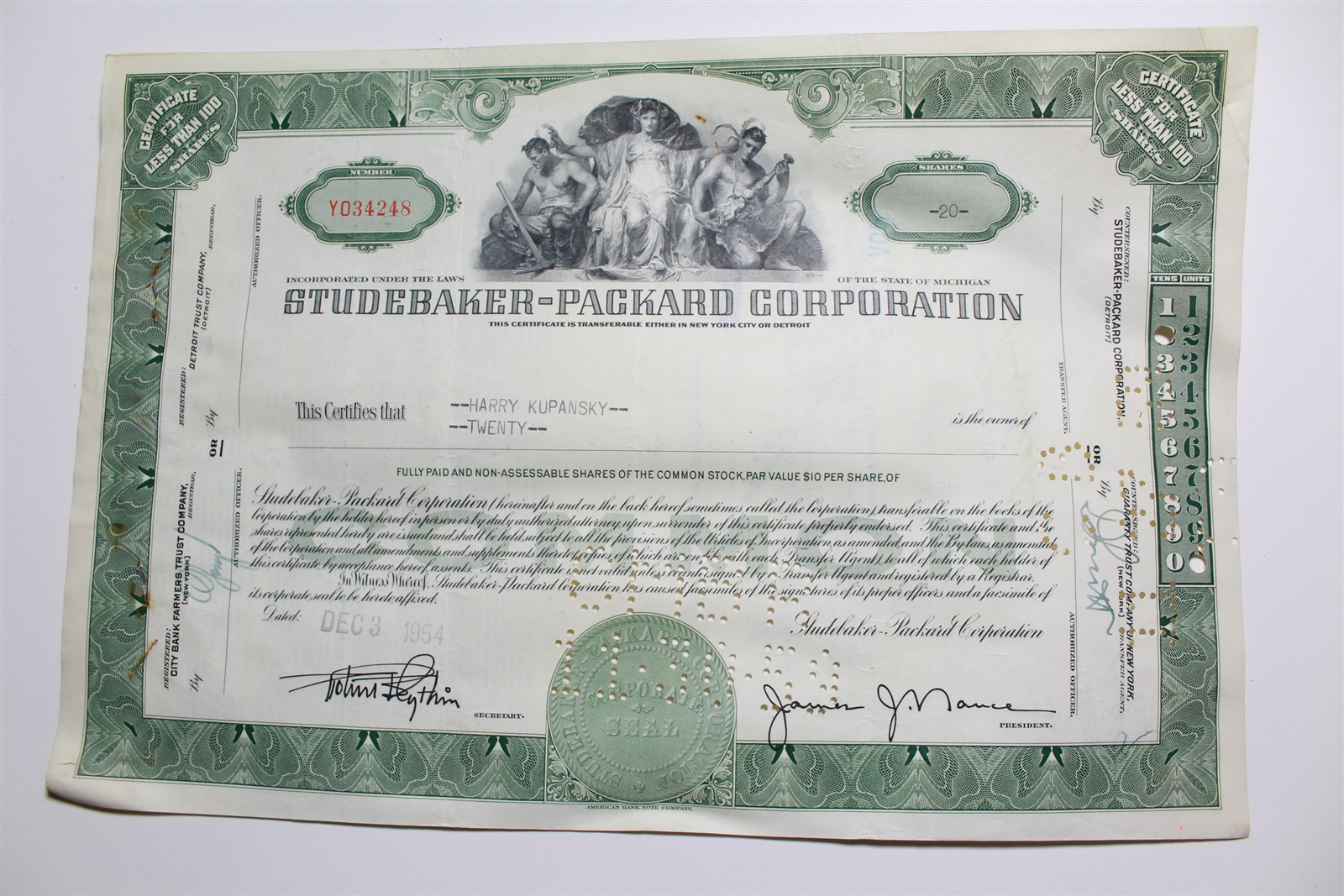 1959 Studebaker-Packard Corporation Stock Certificate 20 Shares Y034248