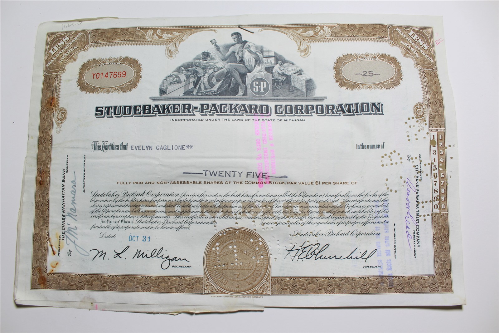 1959 Studebaker-Packard Corporation Stock Certificate 25 Shares Y0147699
