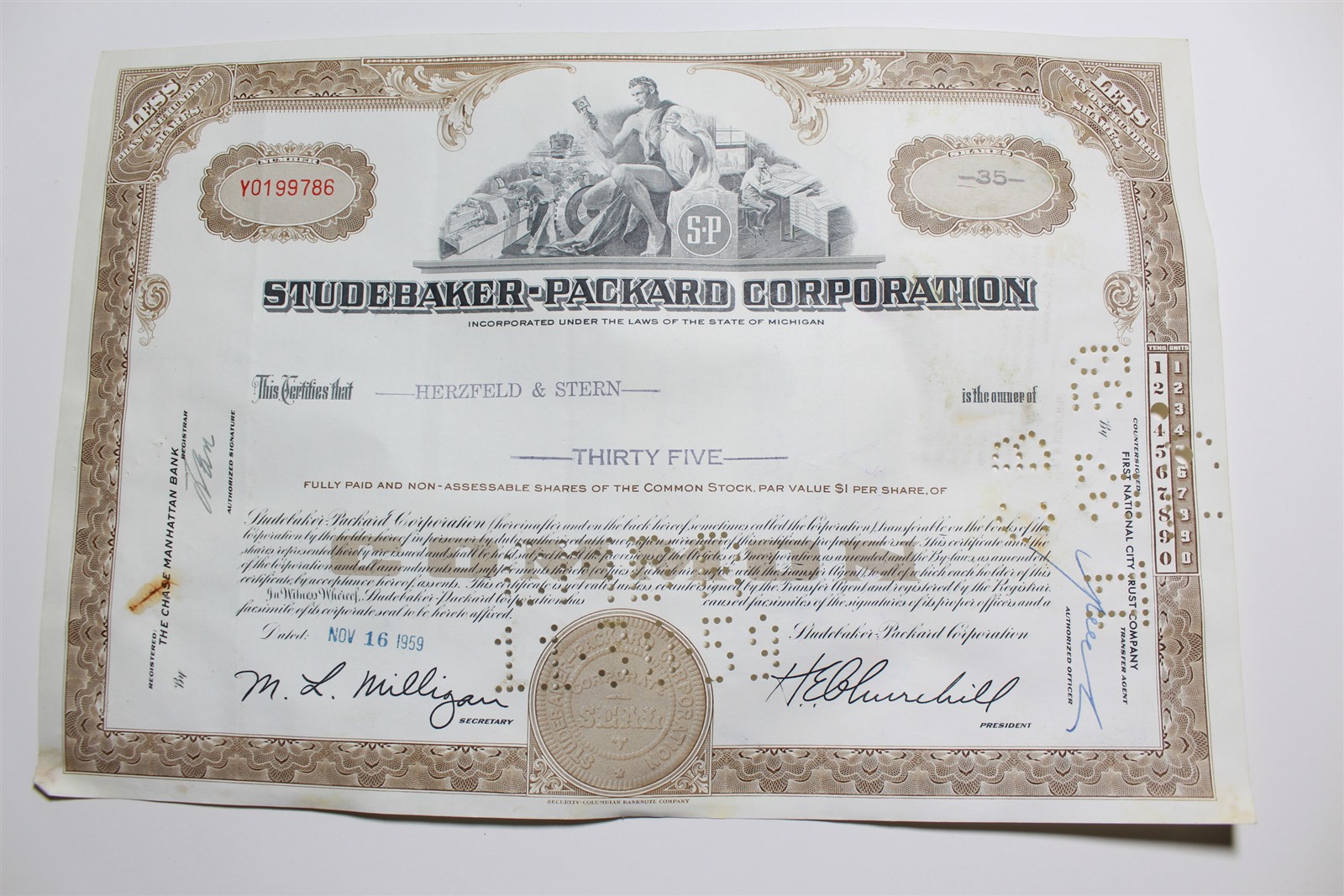 1959 Studebaker-Packard Corporation Stock Certificate 35 Shares Y0199786