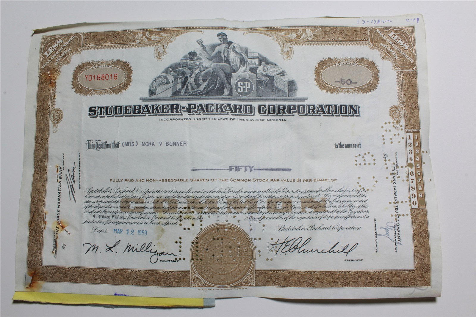 1959 Studebaker-Packard Corporation Stock Certificate 50 Shares Y0168016