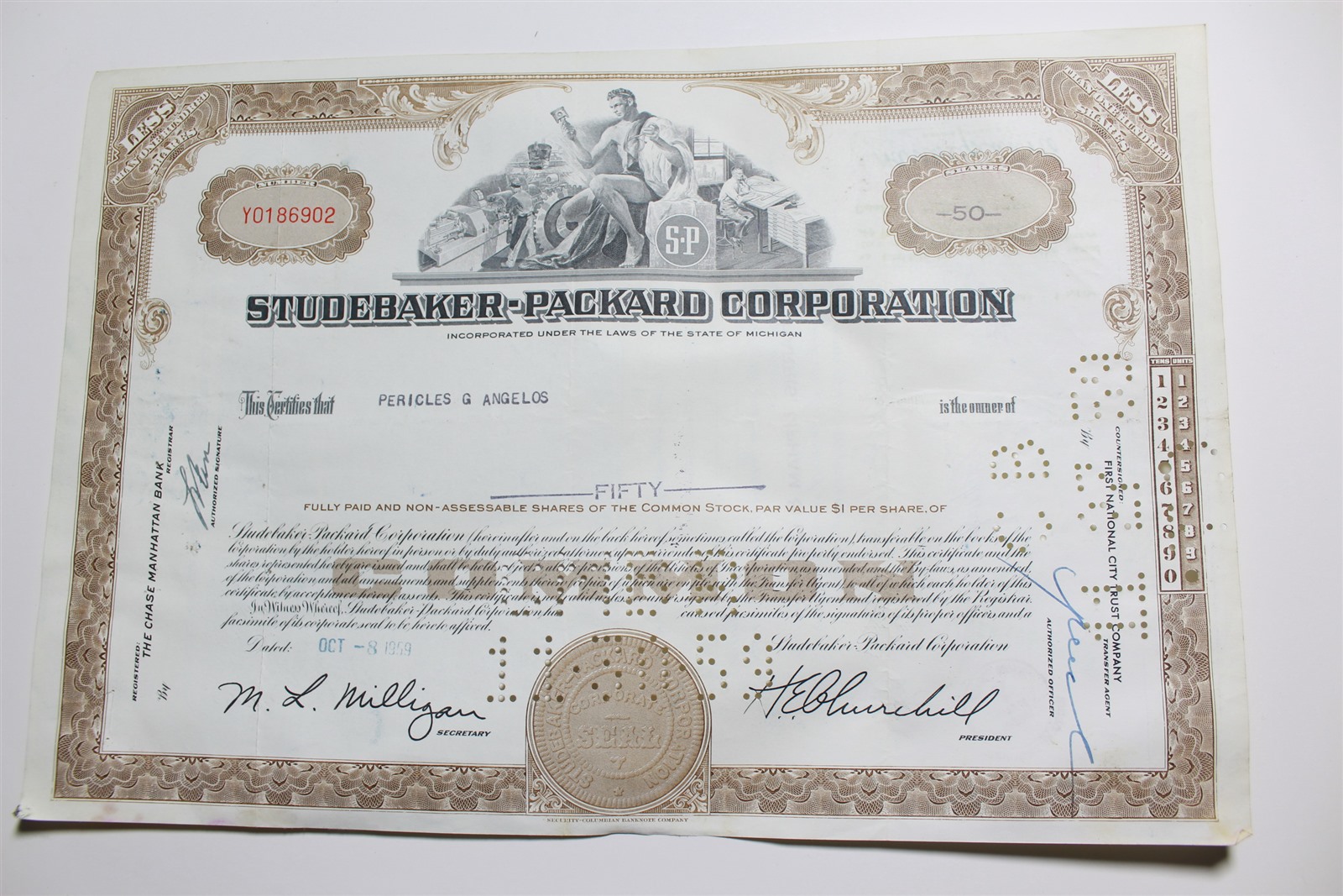 1959 Studebaker-Packard Corporation Stock Certificate 50 Shares Y0186902