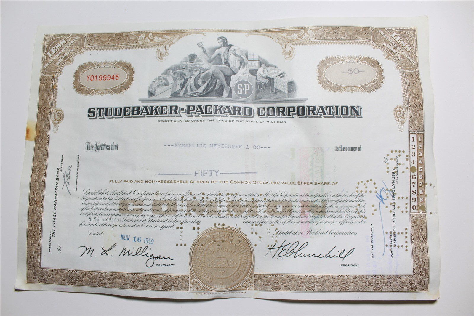 1959 Studebaker-Packard Corporation Stock Certificate 50 Shares Y0199945