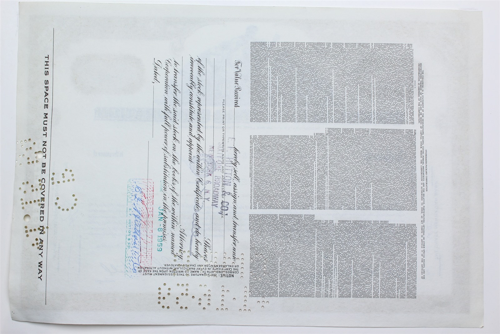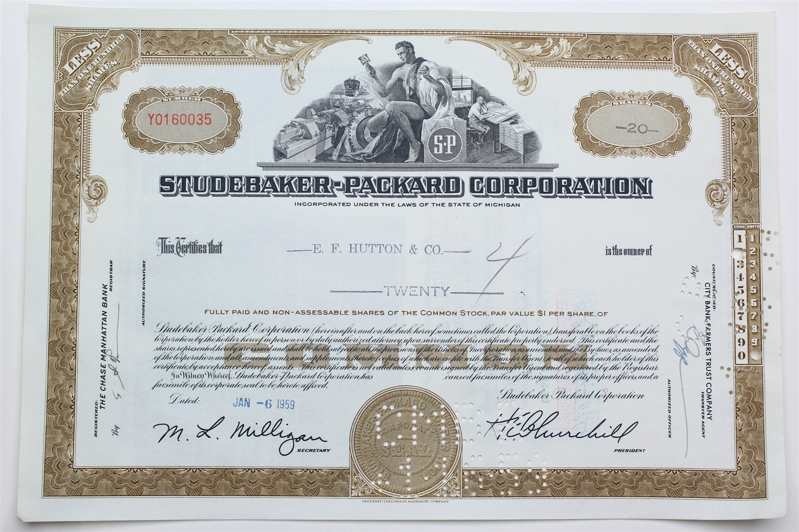 1959 Studebaker-Packard Corporation Stock Certificate - Y0160035 - 20 Shares