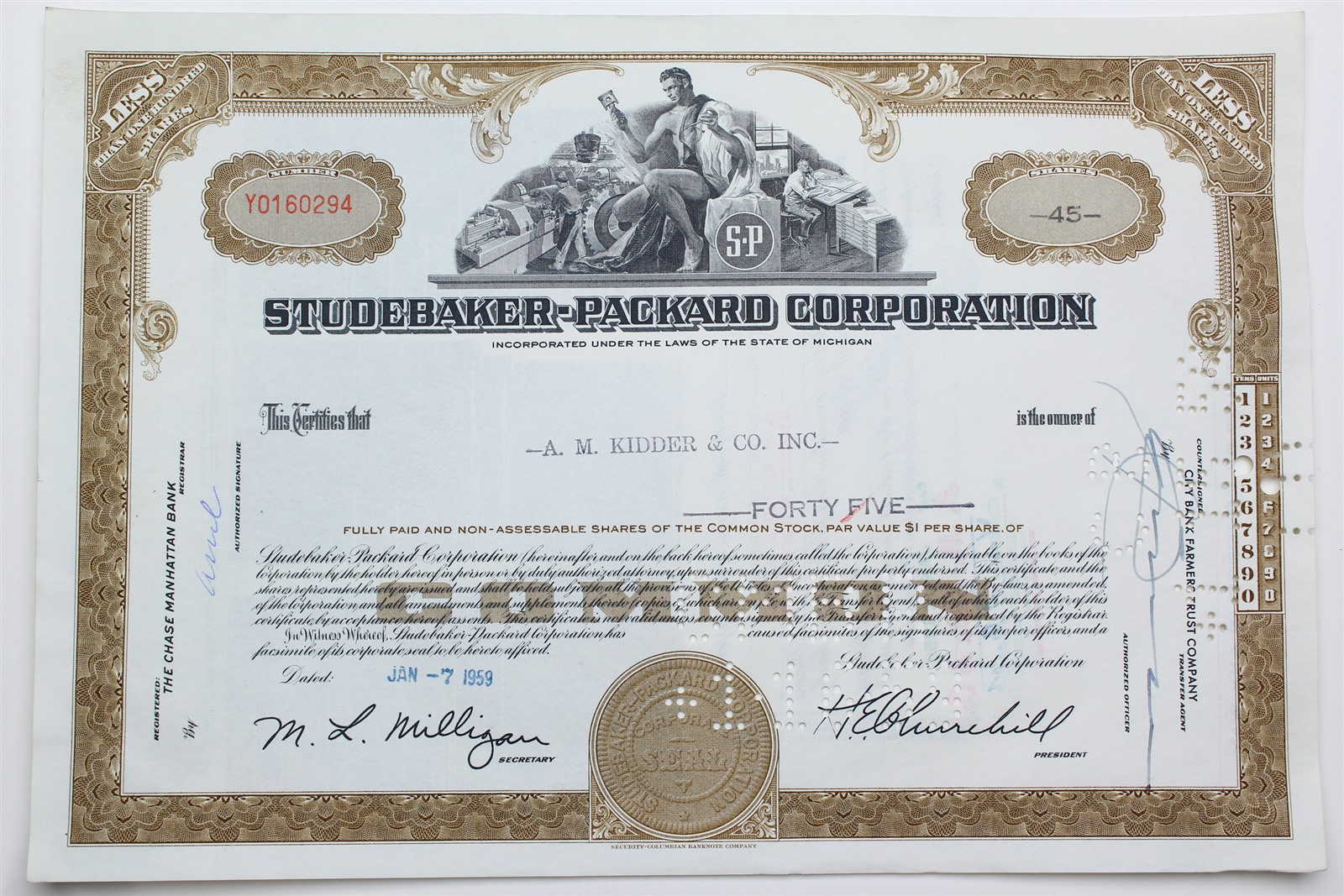 1959 Studebaker-Packard Corporation Stock Certificate - Y0160294 - 45 Shares